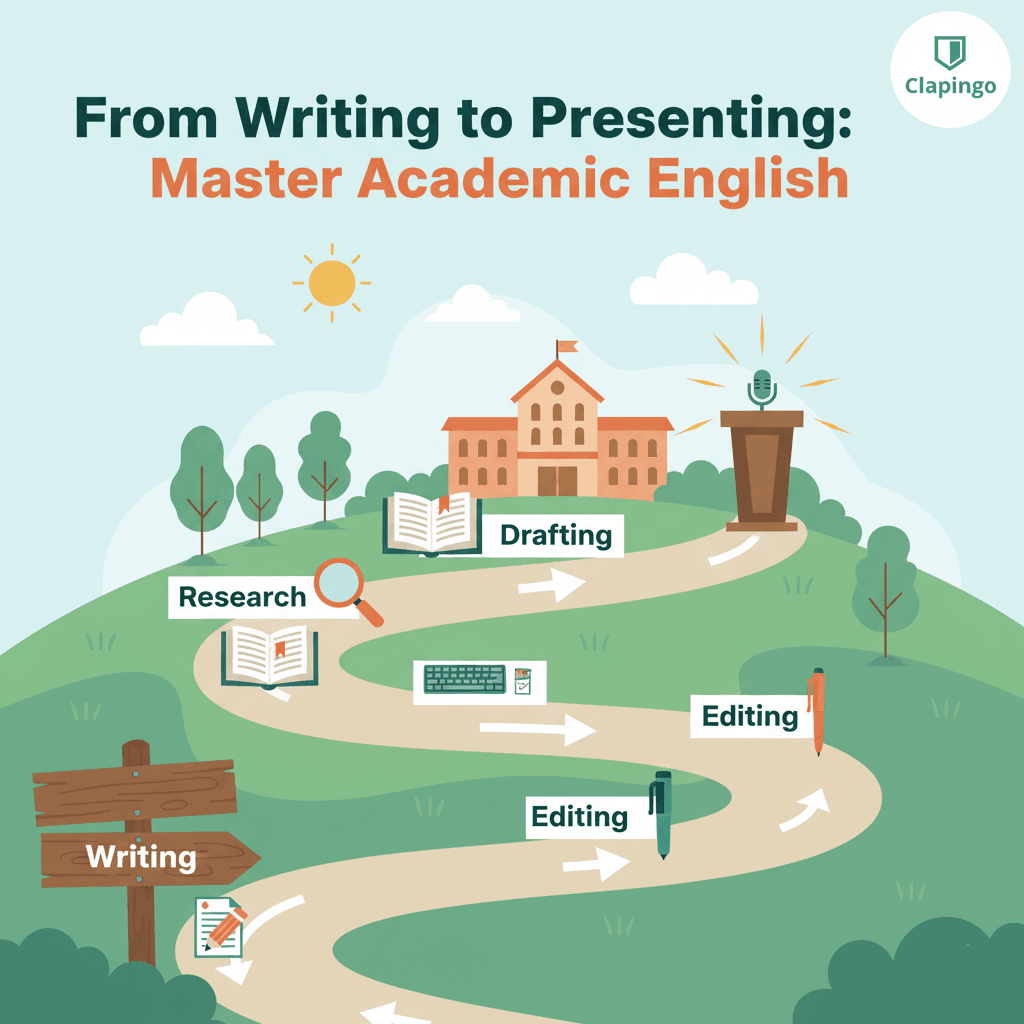 Enhance your Academic English skills with tips on research paper writing, scholarly communication, and conference presentations. Master thesis defense and scholarly speaking with Clapingo.