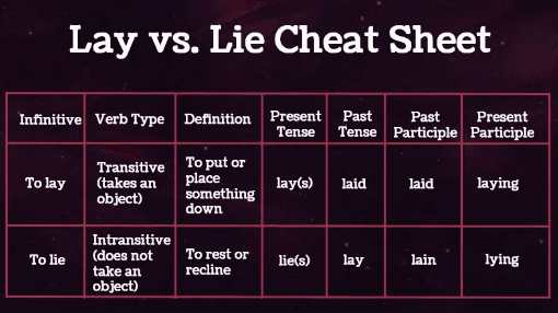 Memorise the handy lay vs lie chart in the following section: Lay (Present), Laid (Past), Laid (Past Participle); Lie (Present), Lay (Past), Lain (Past Participle).